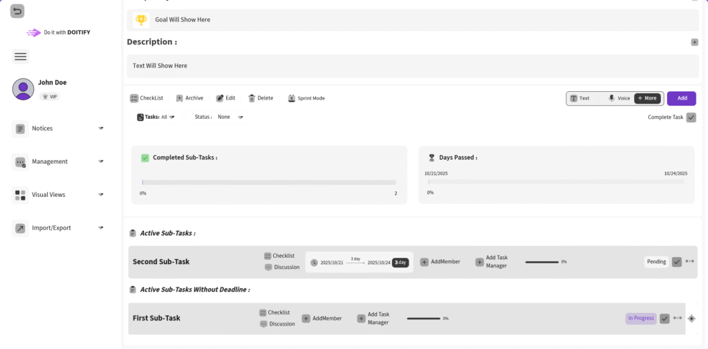 Doitify’s Project Calendar feature offers a visual overview of all project-related deadlines and milestones, allowing users to stay on top of their project schedule and ensure timely completion of tasks.