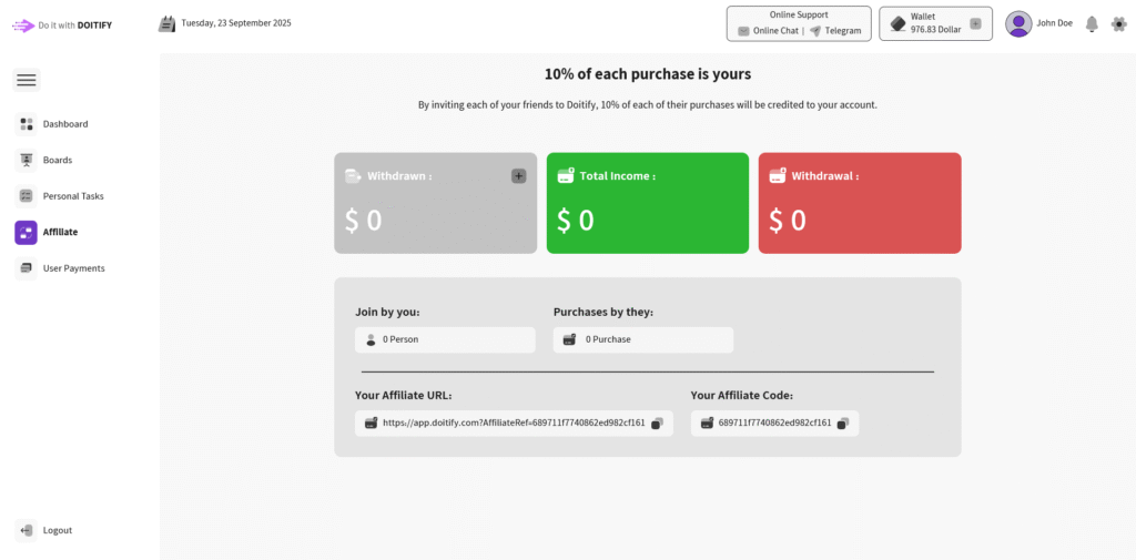 It also provides details about how many people have joined through your referral link and how many purchases they have made. To make sharing easier, the page gives you both a unique referral URL and a personal affiliate code, each with a quick “copy” button.