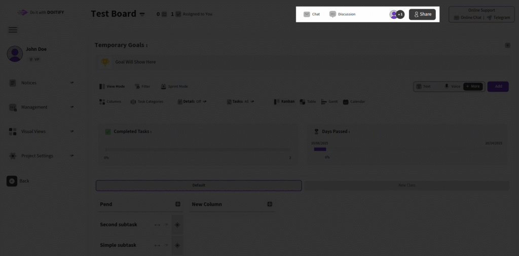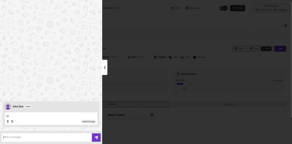 The Chat section enables real-time online conversations with all members on the board, fostering collaboration and quick updates. Access it via the Chat button in the header to open the chat section