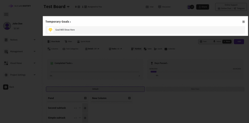 Temporary Goals allow admins to set short-term objectives directly on the board, complete with deadlines and descriptions (Exactly like the papers we stick on the company’s central board). This feature is exclusive to admin users and supports multiple goals, displayed in a sliding carousel for easy navigation. To add your first goal, click the + button in the top-right corner, enter a title in the field, add a deadline and description if desired, and click Add. Existing goals can be edited or deleted via the options menu next to each one.