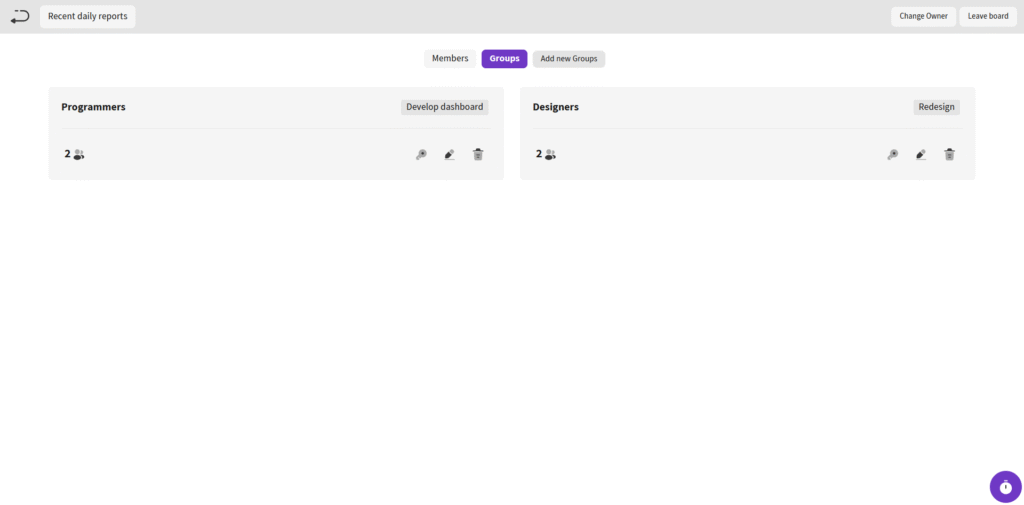 The Groups section provides tools for creating and managing user groups on the board, enabling efficient role assignment and permissions for team subsets.