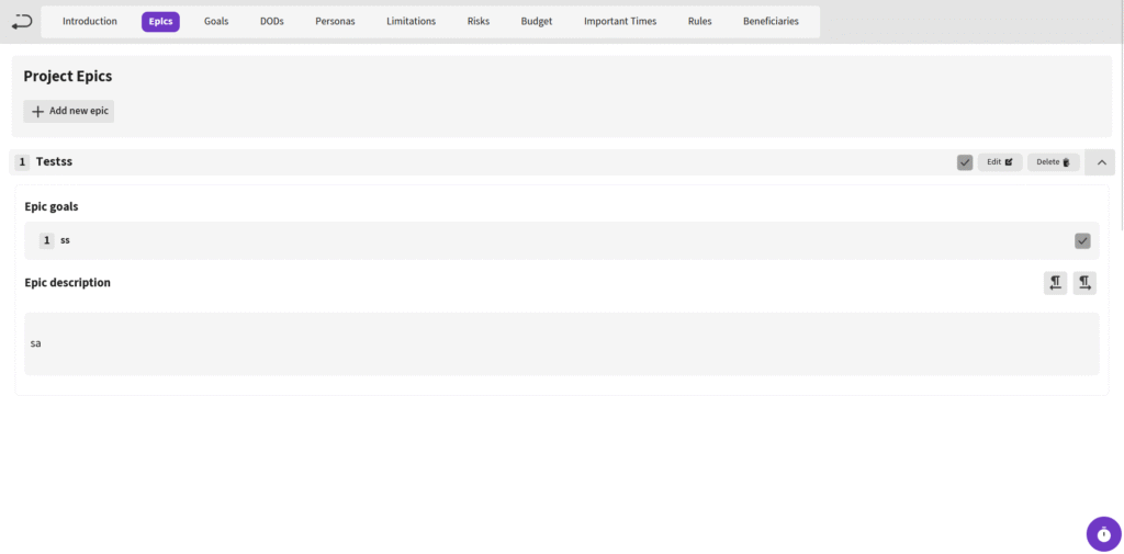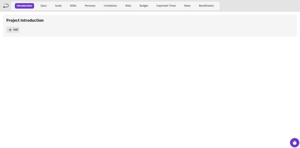 The Project Charter section is a foundational tool for defining and documenting your project’s core elements, ensuring alignment among stakeholders. It includes key components like Project Introduction, Epics, Goals, DODs (Definition of Done), Personas, Limitations, Risks, Important Times, Rules, Shareholders, Suppliers, Legislators, Society, and Competitors. Use this to create a comprehensive project blueprint that integrates with WBS, milestones, and reports for better planning and execution.
