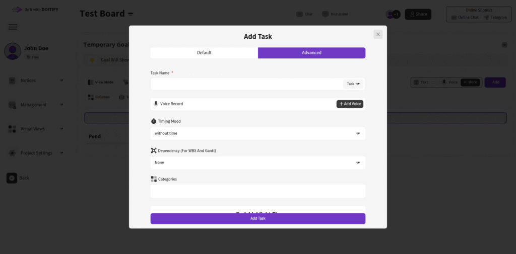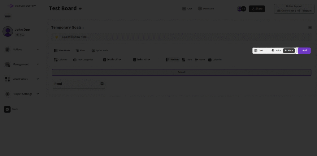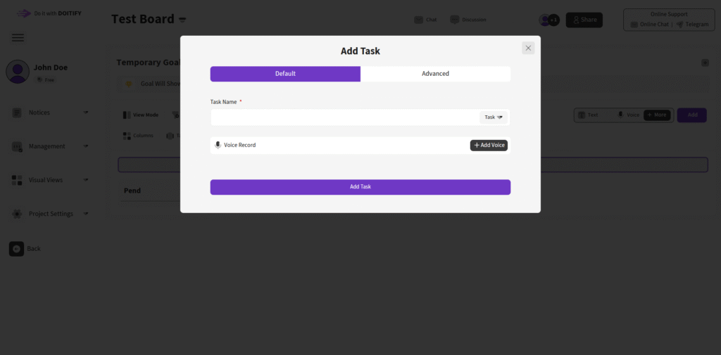 To add a new task in Doitify , First go to the board you want . You can quickly create your task by clicking on the Text or Voice option then click on Add button.