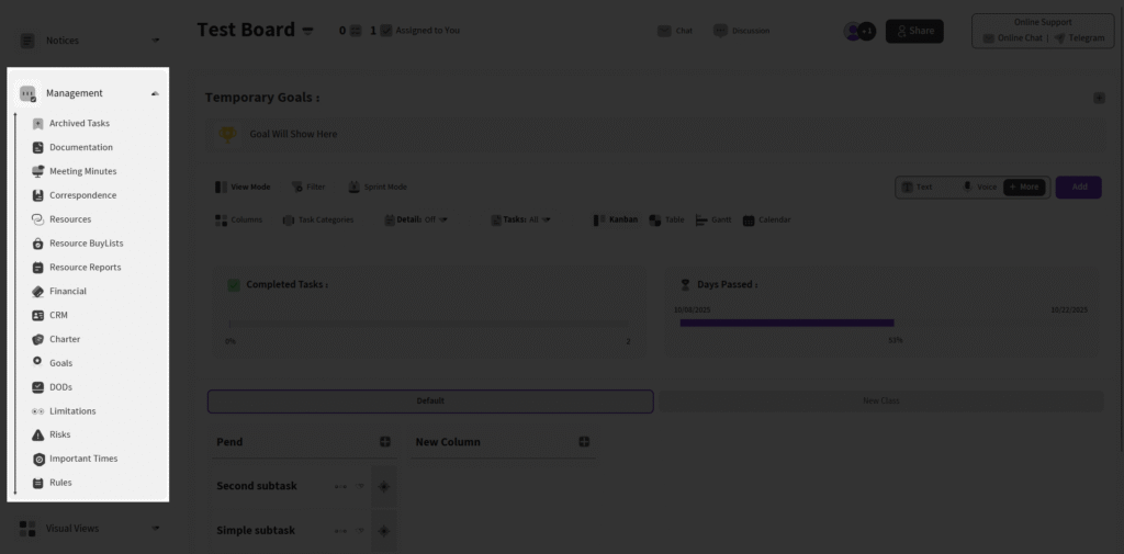 The Management section in the sidebar offers comprehensive tools for organizing project documentation, resources, reports, and compliance, ensuring smooth oversight and tracking.
