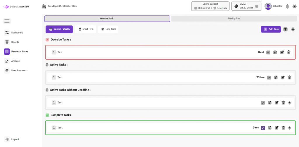 Choose Normal/Weekly for regular tasks, Short Term or Long Term for specific durations, and manage your Tasks — perfect for managing your individual workload with task statuses, time tracking, and action icons (check, edit, delete). in Weekly Plan part you can add your plan and it shows on calendar