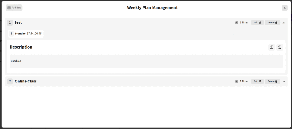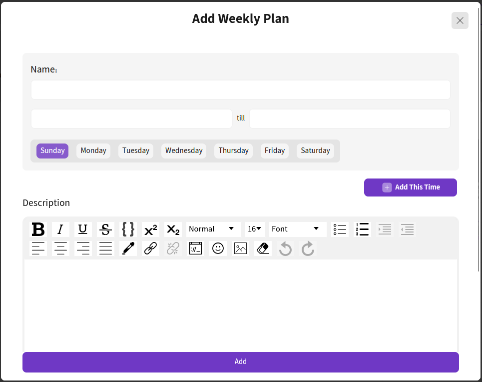 Click Add New in the top-left corner to open the Add Weekly Plan popup. The popup includes: