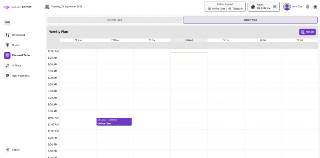 In the Weekly-Plan tab it displays the plans you’ve added on a calendar view. click the Manage button to open the manage interface.