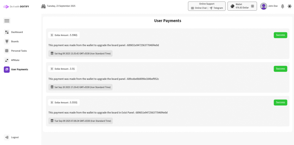 The User-Payments page is designed to provide users with a detailed overview of their payment history and current payment details within the Doitify platform. This page helps users to look at their financial transactions, track payments, and handle billing-related actions efficiently.